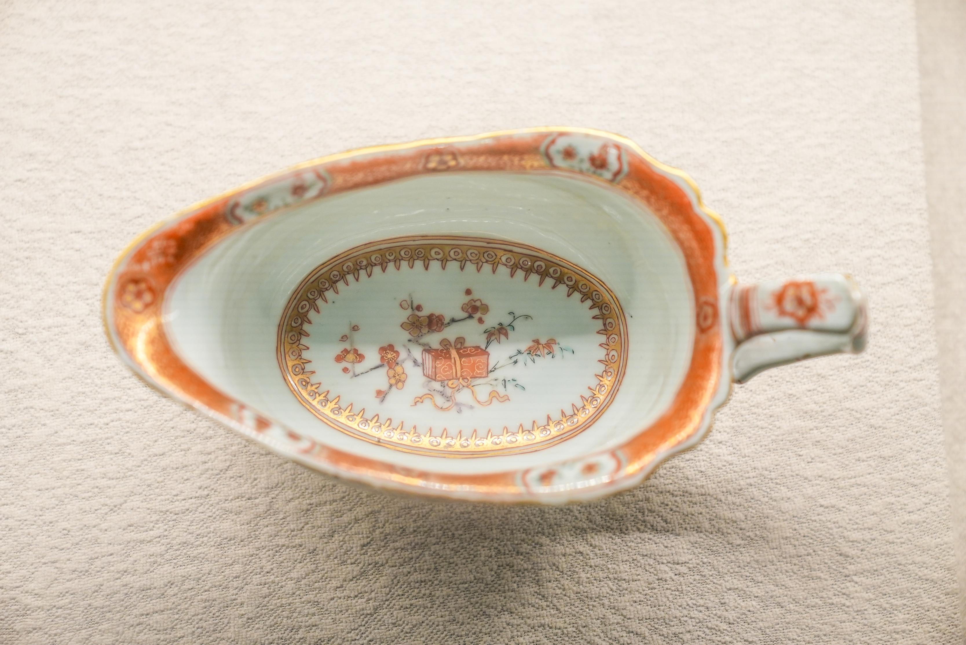 一件清雍正广彩沃尔尼家族纹章纹酱汁杯,造型别致。郑好介绍,这件瓷器模仿18世纪早期西方银器造型,由嘉德勋章院长乔治·沃尔尼男爵定制。杯身绘中式杂宝纹,纹章刻有箴言“美德至上”。