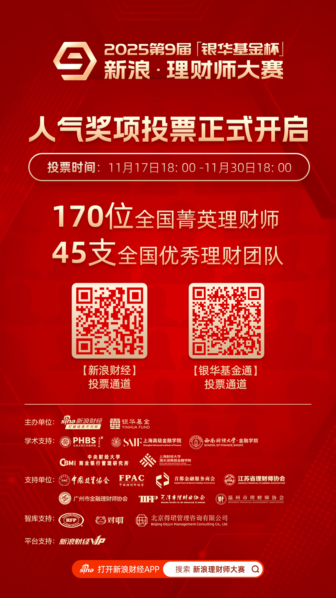 2025(第九届)“银华基金杯”新浪理财师大赛即将进入决赛,为了给选手提供更多展示自我的舞台,大赛为170位全国菁英理财师和45支全国优秀理财团队开启网络人气投票活动,以投资者的眼光选出“最具人气/同业人气理财师(理财团队)”。【进入大赛专题投票】