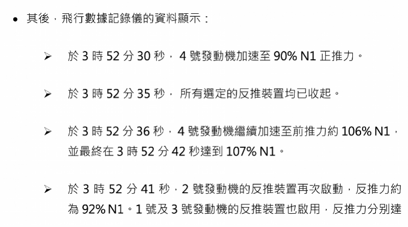 五,随后,飞行数据记录仪的资料显示,位于飞机右侧的4号发动机推力,在飞机降落后曾出现了加速,在飞机的全部反推力装置均已收起后,4号发动机仍在继续加速。在此过程中,该货机的另外三个发动机的反推力装置也再次启用。调查称,这些反推力装置的启用,都发生在飞机偏离跑道之后。
